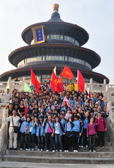 9月30日下午,在天坛公园,师生们漫步在古柏环抱的皇朝庙坛之中,宏伟而又极具民族风格的独特建筑祈年殿、“天人感应”的回音壁、“人间偶语,天闻若雷”的三音石等景观叹为观止。在九龙树的周围,师生们按照导游的指引,纷纷伸出手臂或旗帜一沾龙气。