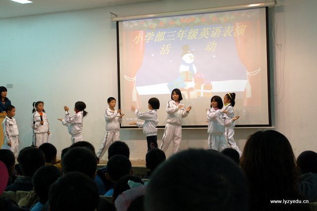 12月4日下午,三年级8个班的同学在报告厅举行英语兴趣活动,各班代表队上台演出英语歌舞。