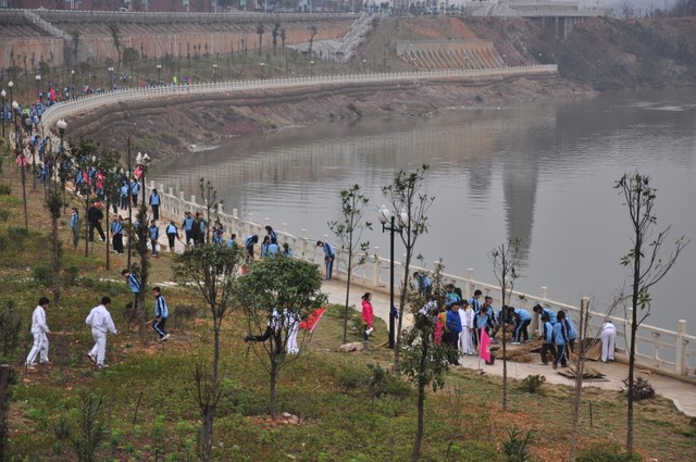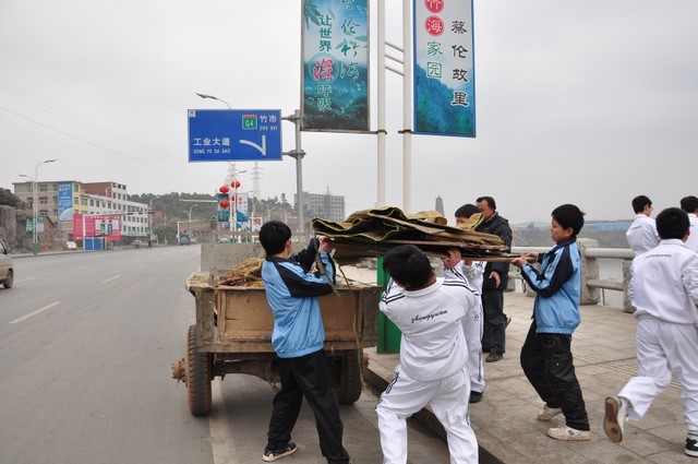 随后,在老师的带领下,同学们举着队牌、彩旗,拿着扫把,提着垃圾桶,排队出发。越过联络线风光带,在长达1000多米的耒河岸边青龙塔地段,同学们有的扫树叶、有的检纸屑、有的清理废品,还有的打捞耒水河边的飘浮物,更有不怕脏不怕累的男同学,抬着一桶桶垃圾,源源不断地送往停在公路边上的垃圾运输车,好一派繁忙紧张的劳动场面。