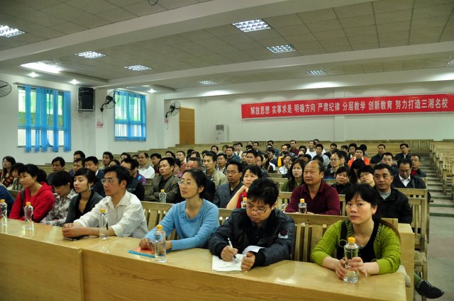 8点时分,与会老师步行参观正源校园后,聚集在报告厅,教育局原教研室主任谭运湘、化学教研员梁六元、正源学校校长罗湘云在主席台就坐。