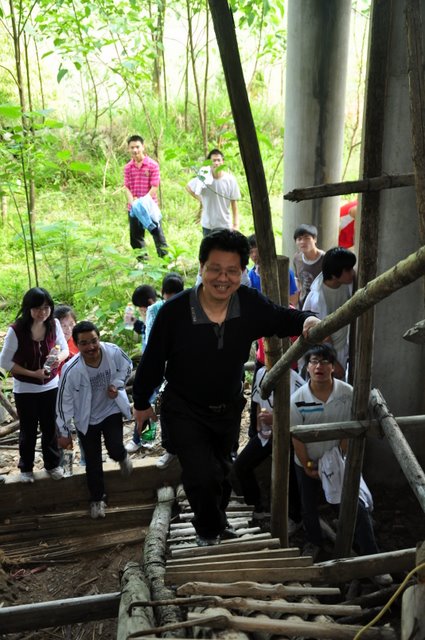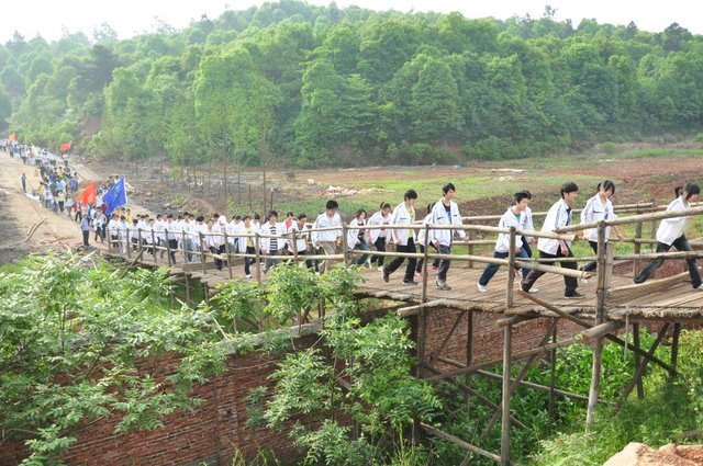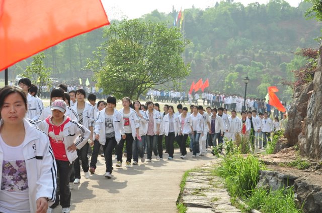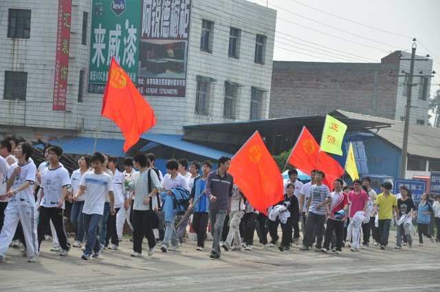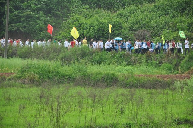 8点许,队伍浩浩荡荡出发了,其路线是出西校门----国际新城----三架乡道------107国道----上岭村(盘古山)。罗校长身先士卒,走在队伍的最前面,时而提起相机抢拍镜头,时而穿梭队伍行间与学生亲切谈心,进行鼓励。
