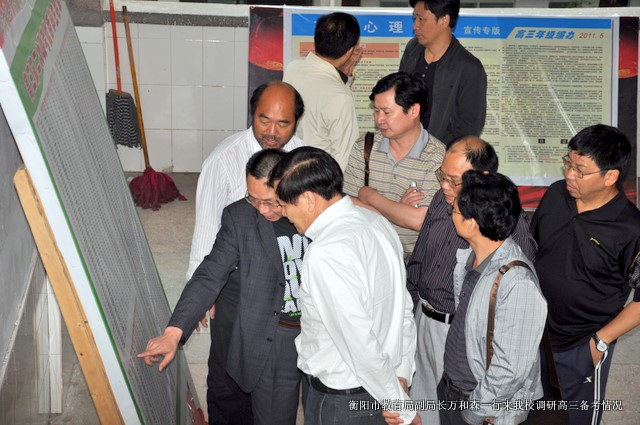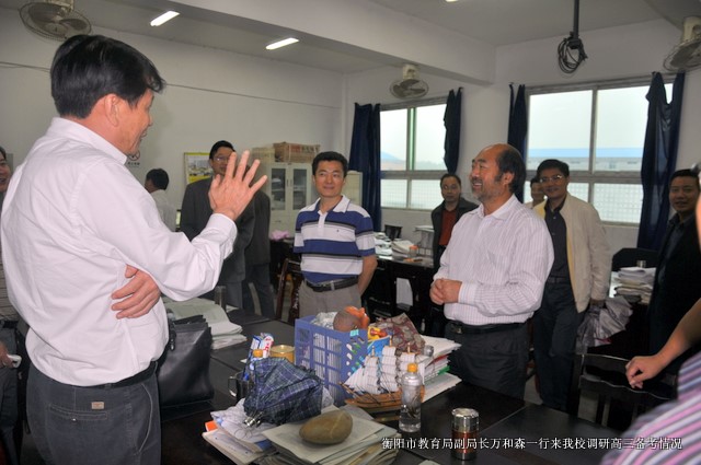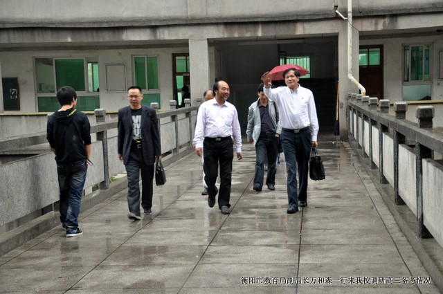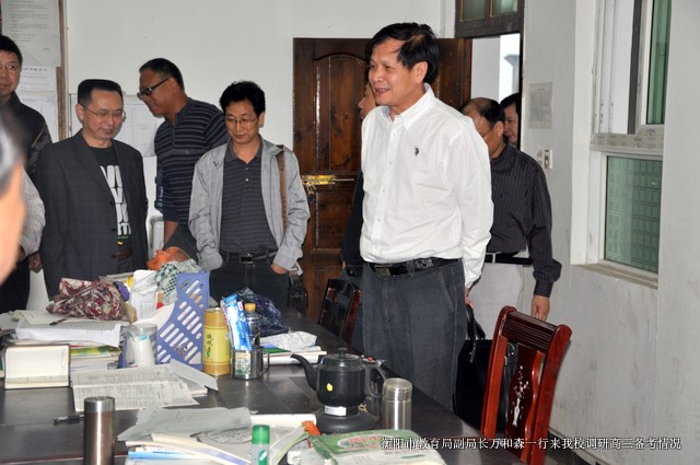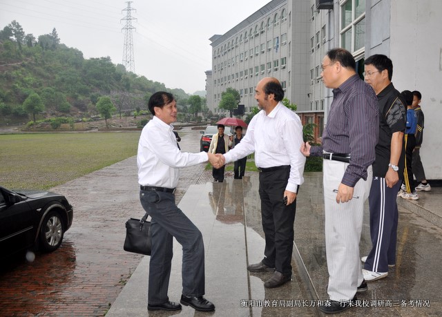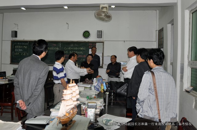 尽管天空不作美,下起了漂泼大雨,但万和森副局长一行还是饶有兴趣地查看了我校高三学生备战今年高考情况。万局长一行先后来到我校高三各班教室前及高三年级办公室,查看了我校高三学生的月考情况及教师备战今年高考的情况,随后在我校会议室举行了一个简短的会议。
