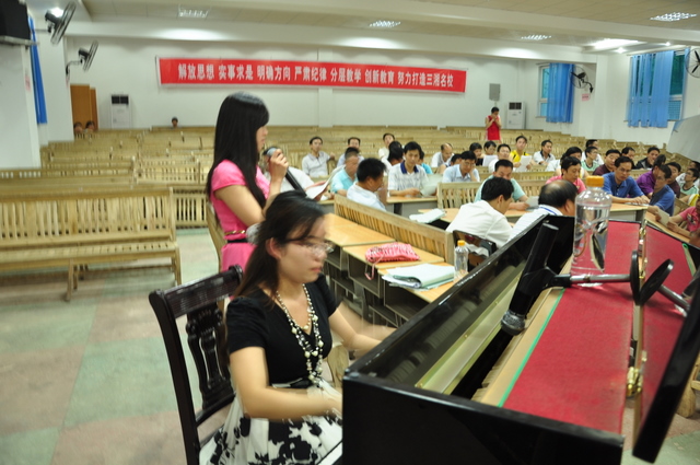 在排练过程中,学校领导不顾工作繁忙,坚持与老师们一起参加排练,充分发挥了领导和表率作用。音乐组老师更是不辞辛苦,他们从发声、到旋律、到表情姿态,处处用心揣摩,精心指导,其扎实的专业功夫和一丝不苟的工作态度,深受领导和参赛教职员工的好评。参加合唱的老师们,听从指挥,服从安排,认真练习,参赛热情十分高涨。