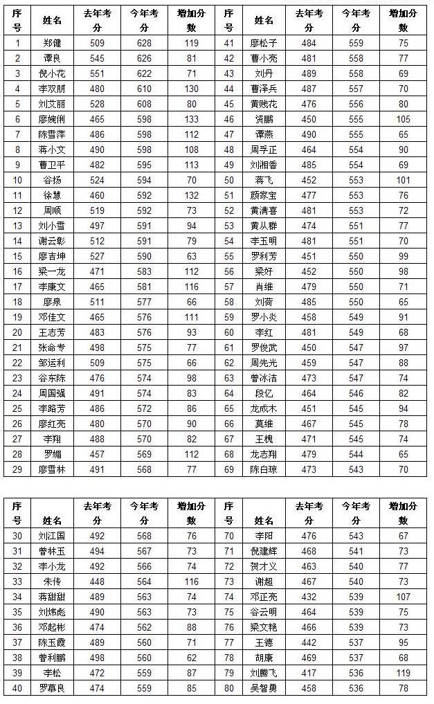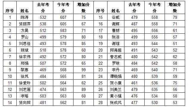 以下为今年上线且成绩提高幅度较大的部分文科考生的成绩对比