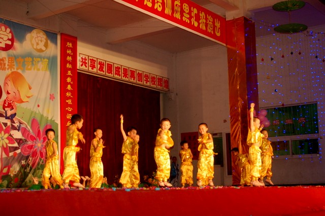 19点20分,随着主持人梁爱军、黄婷、王敏瑶、周逸群的出场,晚会随之拉开帷幕,全场掌声雷动,洋溢在一片欢乐的海洋里。参加这次汇报演出的阵容强大,内容丰富,节目精彩不断。每个年级都表演了各自的节目:学前班的舞蹈《快乐的儿歌》,童真童趣;一年级的古诗新唱《明日歌》,集古今于一体;二年级的快板《夸正源》,铿锵激越;三年级的相声《反义词》,引人入胜;四年级的情景剧《我们共同的家园》,感情真挚;五年级的诗歌朗诵《祖国》,激情豪迈;六年级的歌伴舞《愿祖国花好月圆》,激情豪迈;最后,教师代表队表演的《健美操》,将晚会推向高潮。