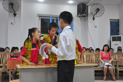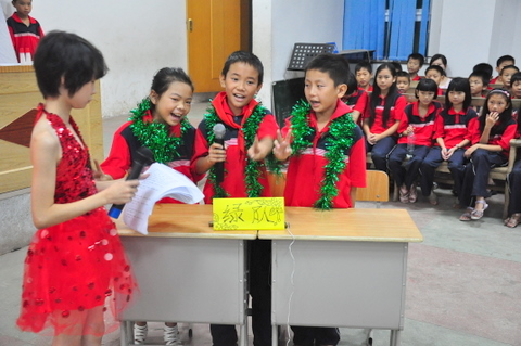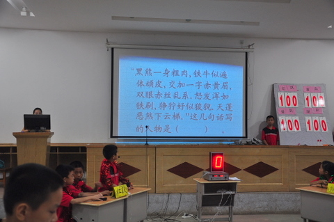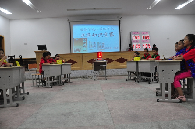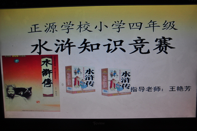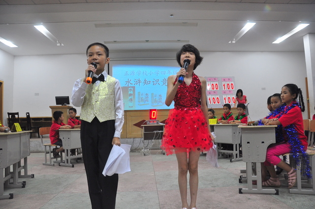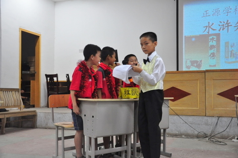 汇报演出分两部分,上半部分为水浒知识竞赛,下半部分为水浒文艺演出。在水浒知识竞赛环节中,从各班抽出的优秀选手组成红、黄、蓝、绿四个小队,每个小队由三位同学组成,竞赛题型有必答题、朗读题、抢答题和风险题,采用图文并茂的形式,并有互动环节,同学们运用平常学到的水浒知识,竞相回答主持人提出的各类问题,全场妙趣横生,将演出推向一个又一个高潮。下半场是水浒文艺演出部分,首先是舞台剧《鲁提辖拳打镇关西》拉开了演出帷幕,稍后登台亮相的是读后感《我读水浒》、评书《林冲捧打洪教头》和快板《武松打虎》,各类形式的演出将同学们带进了一个又一个不同的场面,最后,舞台剧《水调歌头·明月几时有》将晚会演出推向最高潮,随之,整台汇报演出戛然而止。