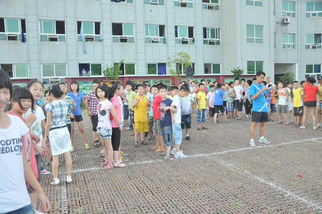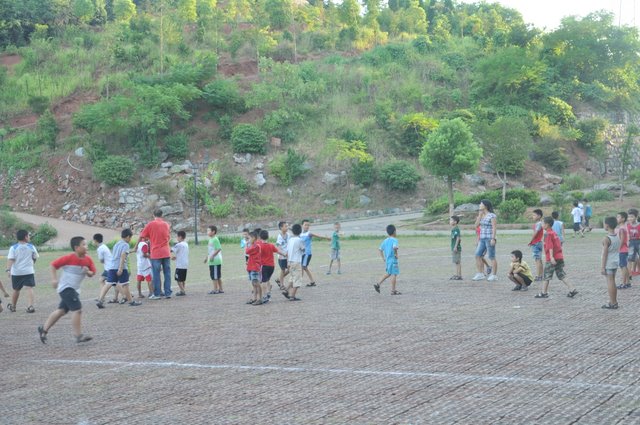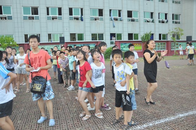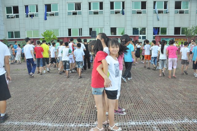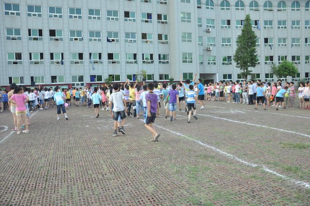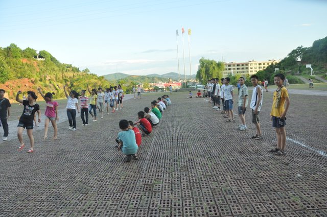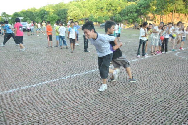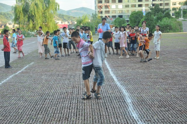 每天下午6点,参加夏令营活动的孩子们就很自觉地来到学校的操场上,这里有两人三足跑、击鼓传球、夹气球比赛、拉网捕鱼、踩气球比赛……,只要来到学校广场,总有一样游戏吸引孩子们参加。有的两两手夹着手,背顶气球,快速向前奔跑;有的在老师的带领下,玩拉网捕鱼的游戏;有的在跳皮筋……。虽在盛夏,但学生们参加活动的热情非常高涨,没有一个因为天气炎热而退出,都是踊跃地、自主地参加到活动中来。