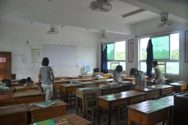学生在教室摆放书籍