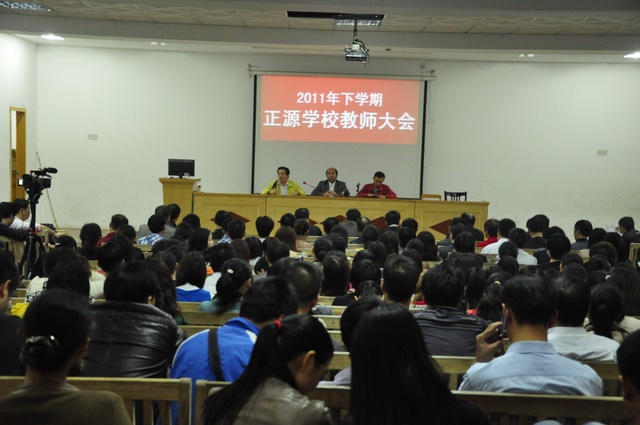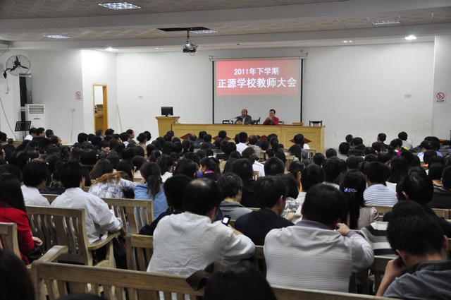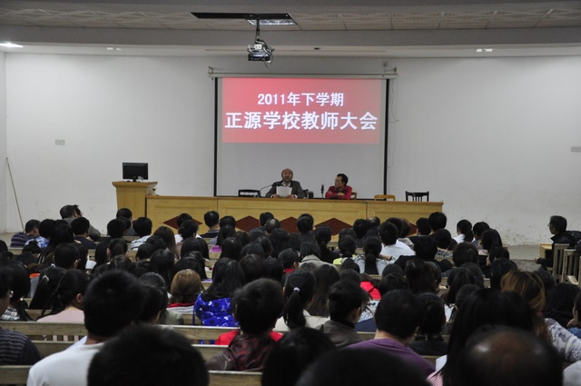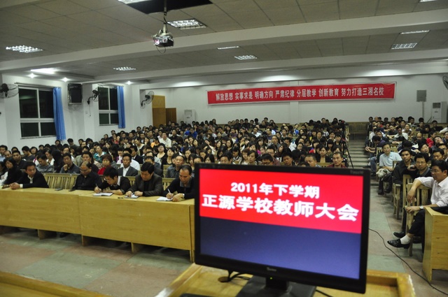 罗校长在讲话中首先通报了正源学校本学期有关主要数据:学生人数9394人,教师404人,生活老师143人,加上后勤服务和管理人员,全校已经突破10000人。第二,讲述了学校在发展过程中遇到的现实问题,尤其是西边学生安全通道受到严重侵噬的问题。第三,提出了正源学校发展方向和目标,要争取在一个较短的时期内,创建分校,使学生总人数达到30000人。第四,重点阐述正源学校的办学理念和办学特色。其中指出:从严治校,以苦为乐;分层教学,整体推开;真抓实干,责任为重;舞活龙头,全盘跟进;加强校园文化建设等。第五,要加强学生管理。第六,加强教师管理。强化责任,完善制度。第七,教学改革,加强学案工作,加强听写、阅读、开展教学竞赛,丰富课外活动。第八,教师福利工资待遇的有关原则。