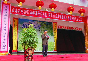 2月24日上午,正源学校万人师生员工齐聚校广场参加“春到正源”2012年春季开学典礼、高考百日攻坚大会和迎新春文艺汇演。罗湘云校长出席典礼并作重要讲话。 学生们有秩序的入场后举行了升旗仪式,仪式结束后罗校长发表了讲话,他用一组组的数据对上期正源学子取得的骄人成绩给予极大的肯定和鼓励,并勉励学子们再接再厉、争取更上一层楼。校长强调,实践证明我们全封闭式、全寄宿制、偏小班化的办学模式;分层教学的理念;进校即思进取、怕苦莫来正源的办学思想为我们全体师生打造了一个无与伦比的舞台。校长特别指出要让每一个孩子找到适合自己成长的道路,并描绘了未来正源的美好蓝图!随后党支部书记、高三年级主任毛小波作了主题讲话、朱明之主任带领全体