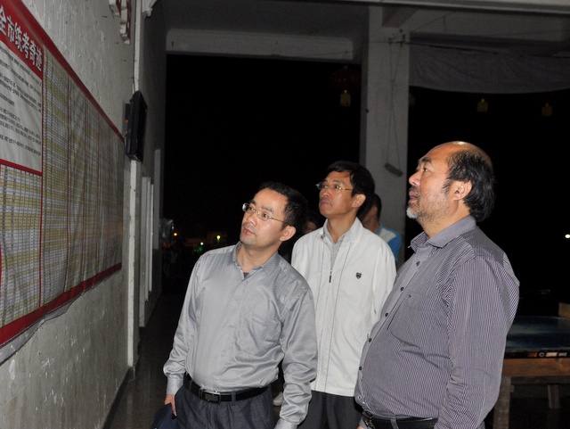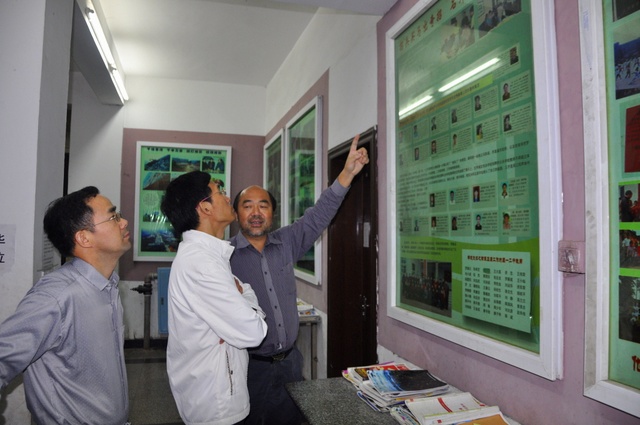 在交流大厅,罗校长向省民教协会副秘书长黄为(右)和行知中学校长肖海波(中)介绍正源学校办学历程