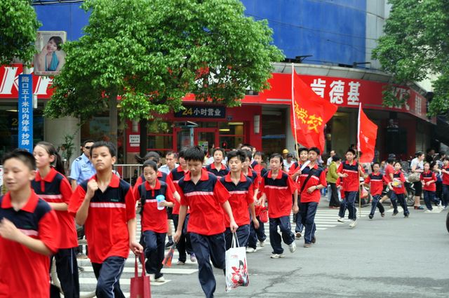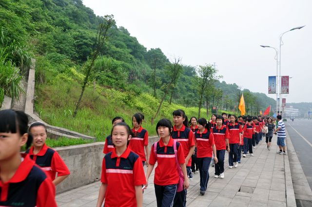 稍事休息之后,上午九点时,身着校服的孩子们按班级各分两列从学校广场出发了,很快1600多学生的方阵演绎出一条红色长龙。各班旗手高举各色彩旗,队伍井然有序的前进着。每当行至岔路口和红绿灯处时,由学校行政人员、司机和保安共同组成的“交警队”便会守在旁边指挥交通确保队伍安全通过。孩子们一路行来,时不时地高呼班训口号,引来无数路人瞩目,不时有人询问我们是哪个学校的,要去哪里干什么,孩子们总会开心地很有礼貌的告诉他们,他们往往也报以赞赏的一笑。
