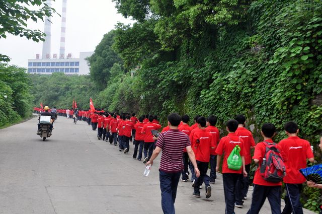 队伍经高速公路联络线、德泰隆路、群英路、金南路行至电厂大桥时,电厂上空的黑烟似乎吓退了清风,天空显得灰蒙蒙的,天气此时也变得有些闷热,汗珠开始在孩子们的发梢闪亮,而此时天空不知飘落了什么,一点点黑如细绒的东西黏在我们脸上、手臂上,孩子们开始皱眉抱怨,说电厂的空气不好。不过,他们很快便兴奋起来,因为居然早有学校生活车在此等候,一个个装满矿泉水的纸箱子在路边相对一字排开,生活老师示意他们每人取一瓶,几口水下肚,刚产生的一点怨气便一洗而空了,他们身上又绽放出青春的活力,笑容也从他们红扑扑的脸上满溢了出来。