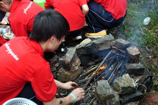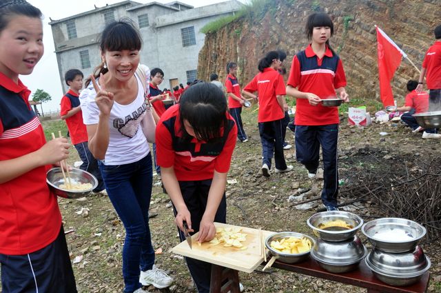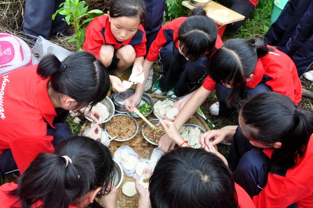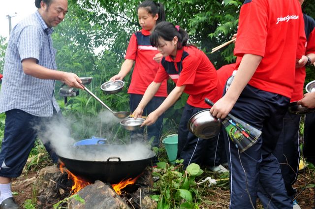 拍完照后,各班分头行动。垒石为灶,打水洗刷,拾柴生火,干得热火朝天;包饺子,刮土豆,洗苹果,忙得不亦乐乎。看着渐煮渐熟的饺子土豆面条,孩子们闻香而动,吃着自己亲手做出的食物,他们连说好吃好吃,他们的笑容是那么的灿烂,心情是那么的舒畅。
