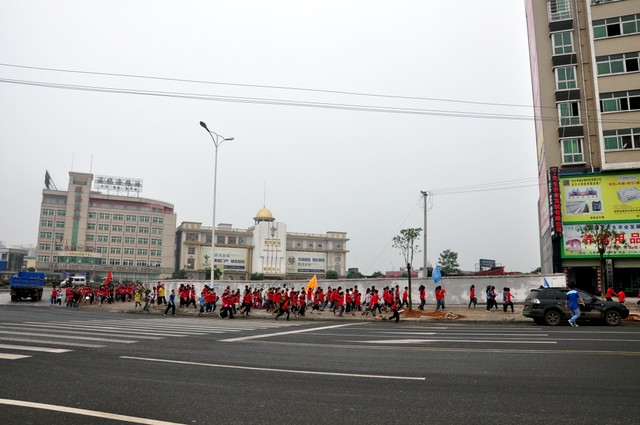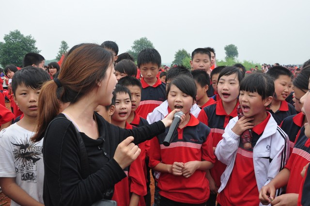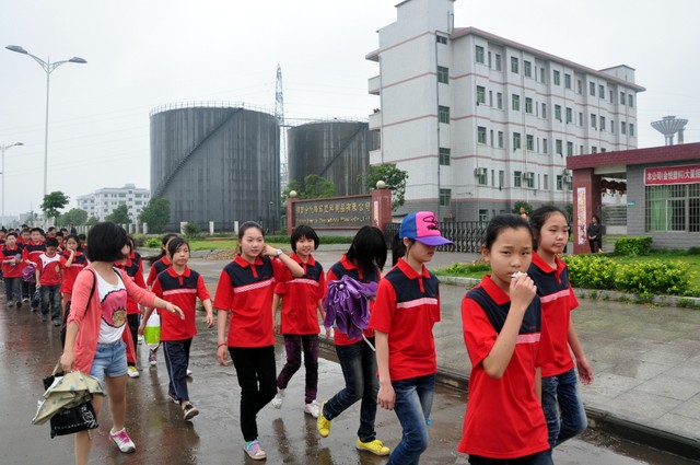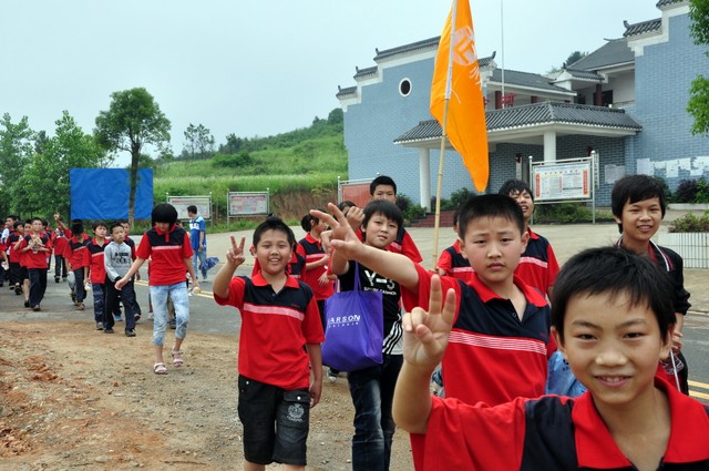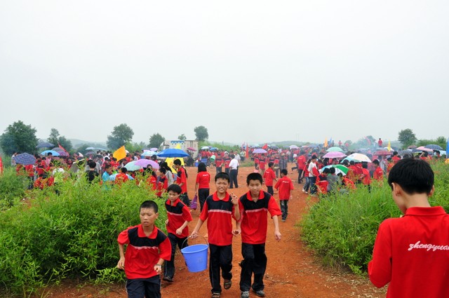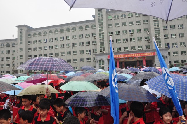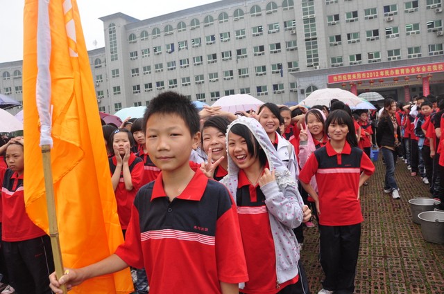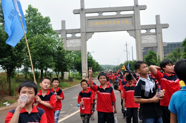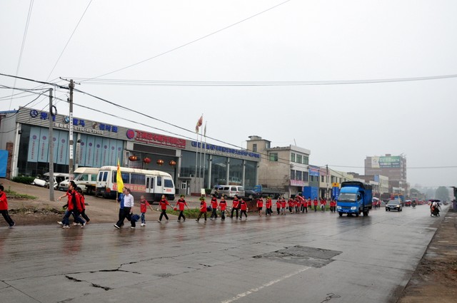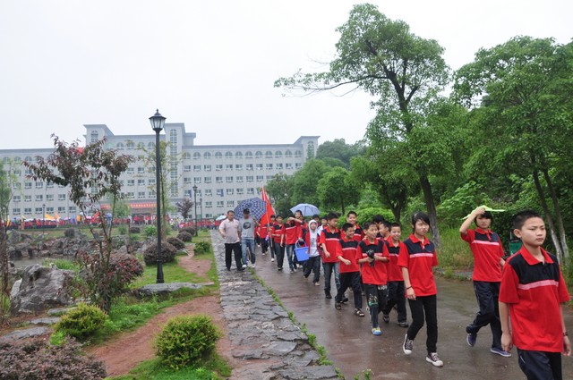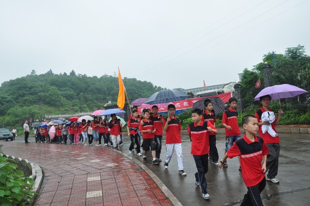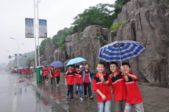 这一天,六年级全体同学吃完早餐即到学校广场集合准备出发,罗校长和刘德主任分别跟大家说了一些应注意的事项,可天下起了小雨。老师和同学们在广场上等待着雨停,可雨却越下越大,大家都打起了伞。罗校长一句“下雨了,去还是不去?”引出六年级全体同学异口同声的回答“去”!回答得很干脆、很兴奋、很坚定。同学们在雨中出发了。