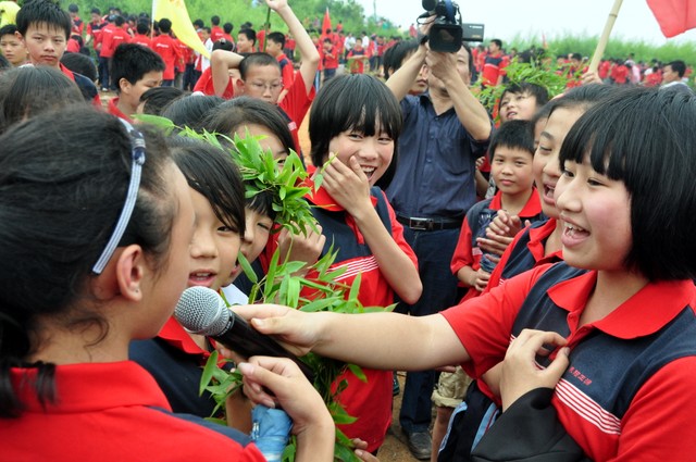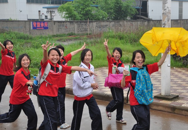 同学们非常高兴,一路有说有笑,有的同学唱起了歌,有的同学带动班上其他同学背诵学过的和大自然有关的课文。每当照相机对着他们时他们都会大方地摆出自己觉得很漂亮的姿势。看到有相机的老师,他们会大声地请求给自己拍一张,那表情让人无法拒绝。老天似乎也被同学们感染了,笑了,雨越下越小,终于停了。