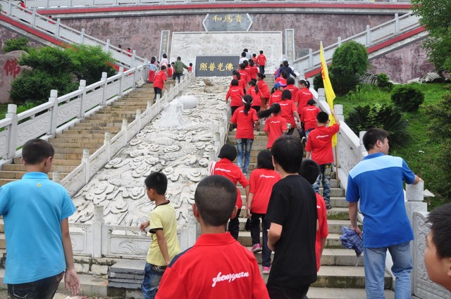 终于来到盘古庙,六年级16班依次在盘古庙大门前拍集体照留作纪念。同学们拍完集体照后就自行在寺庙参观,大家都被寺庙的氛围感染,纷纷跪下拜佛,看到被装饰得很精美的佛像,他们要驻足停留好久。