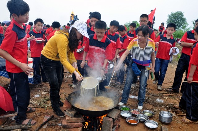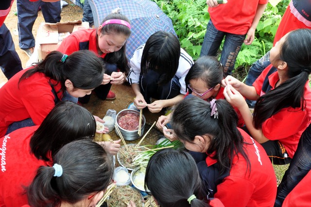 参观完盘古庙,大家上山野炊了。拾柴,打水,垒灶,起火,烧水,包饺子……大家分工明确,忙得不亦乐乎!雨在大家的繁忙中又下起来了,大家打伞干着手中的活。很快,一锅锅饺子、一盆盆面条出来了,同学们吃着自己的“劳动果实”,有滋有味。雨不知何时停了,有的同学“吃兴”不了,把吃剩下的生土豆找出来烤。这边烤土豆,收拾东西,那边音乐响起了,原来罗校长带着一部分同学在唱歌。同学们欢乐的声音飘荡在盘古庙上空,给这座崭新、神圣的寺庙增添新的青春的气息。