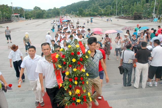 中餐之后,工人们来到毛主席铜像广场和毛氏家史馆。在铜像广场,他们怀着无比崇敬的心情向主席铜像敬献花圈,并在主席铜像前三鞠躬,然后绕像一周,在主席铜像前合影留念。导游介绍说,新扩建的铜像广场处处都有它特别的寓意,铜像坐南朝北,寓含主席遥看故居,心系北京城;铜像下石墩高4.1米,寓含主席执政41年;铜像高6米,寓意主席一家为革命牺牲了六位亲人;总共10.1米,正含义着国庆日;瞻仰大道总长183米,宽12.26米,寓含主席身高1.83米,生日12月26日;人们把对主席的无限怀念都寄托在这广场之中了。