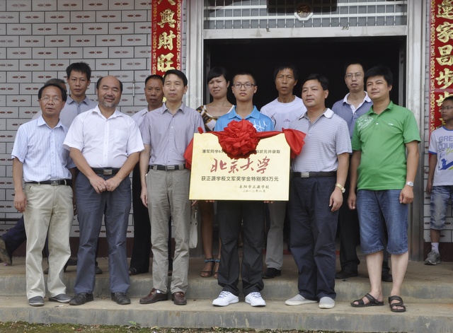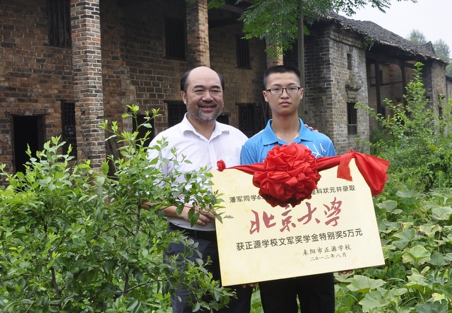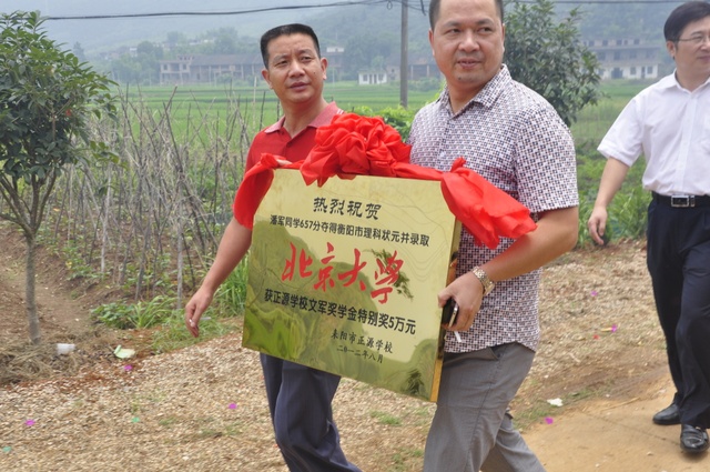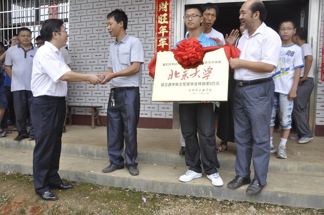 梁晓斌董事长和罗湘云校长为考取北京大学的潘军同学颁奖