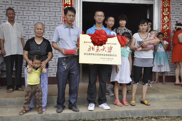 在潘军的爷爷奶奶住宅前面,梁晓斌董事长亲手将5万元现金交到潘军的父亲手中,这是专门为潘军同学颁发的“正源学校文军奖学金”特别奖,同时,还为潘军颁发了奖牌。