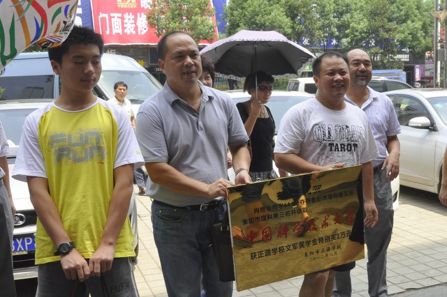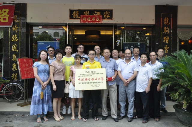 中午12点,罗校长梁老师夫妇以及学校有关行政领导和老师应邀前往赴宴,对肖煜华及家人表示祝贺,并为肖煜华颁发了奖牌和2万元“文军奖学金”特别奖。