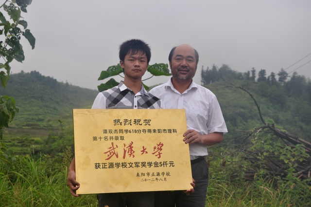 8月22日上午10时许,罗校长率学校行政管理人员与部分任课老师及衡阳电视台工作人员驱车来到龙塘镇谭双杰家中,在欢声笑语和礼炮声中为谭双杰同学颁发5000元“文军奖学金”和奖牌。期间,谭双杰及家人以及谭双杰的班主任吴小军老师还接受了衡阳电视台生活频道记者的采访。