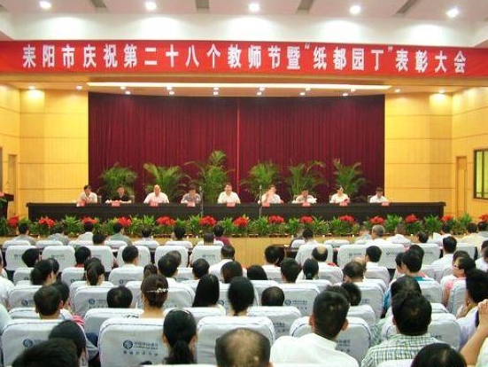 9月10日上午,耒阳市隆重召开庆祝第二十八个教师节暨“纸都园丁”表彰大会。市委书记唐文峰出席会议并发表重要讲话,市委副书记、市长蒋云良为大会致辞。市委常委、副市长李莲贤主持大会,市委常委、宣传部部长廖德萍宣读了《中共耒阳市委、耒阳市人民政府关于表彰全市“221纸都园丁”的决定》。陈纪琪、刘作钦、雷秋生、彭家成、陈飞等市领导出席大会。