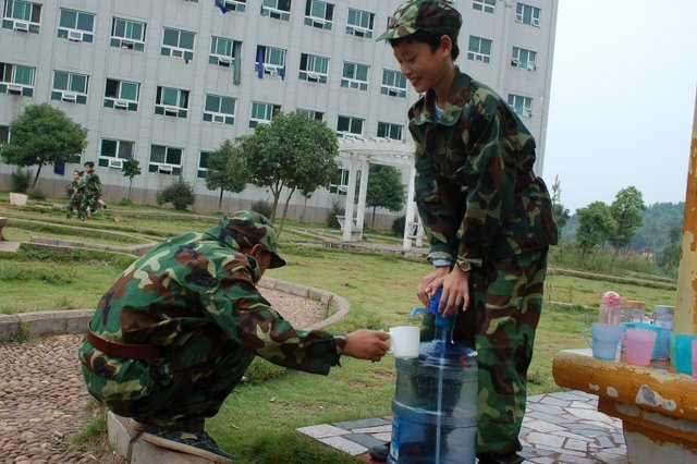 队列当中还有一些带病带伤坚持训练的同学。虽然有些同学在训练过程中出现晕倒现象,但他们起来之后依然挺立在队伍之中,一直挺到最后。其中134班的郭军同学晕倒后脸色发白、牙关紧咬,稍作休息后爬起来,要求继续坚持参加训练。125班的龙思如同学不慎晕倒摔伤,脸上划开了一道口子,到医院缝了几针之后,下午赶到了队伍中继续参加训练,她表示绝不会掉皮掉肉掉队。而130班的李泽丰同学则以另一方式表达了他的坚强。他的脚受了伤,老师决定让他休息,可他却在旁边为班级搞起了后勤服务,跑来跑去一刻也不肯停下……