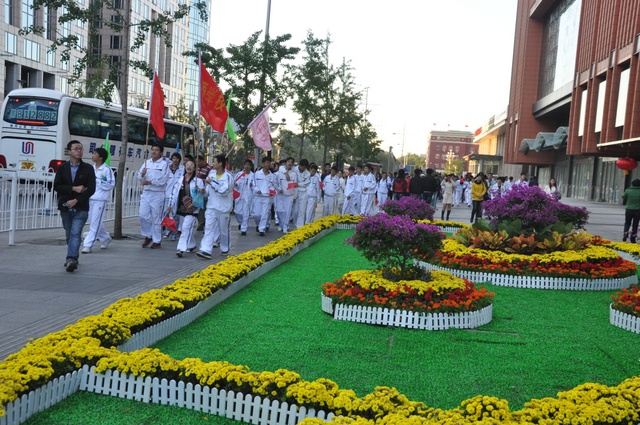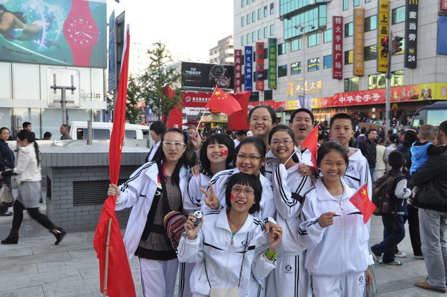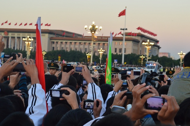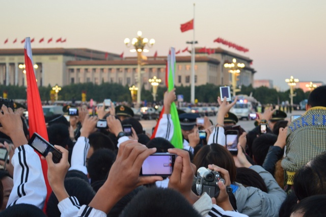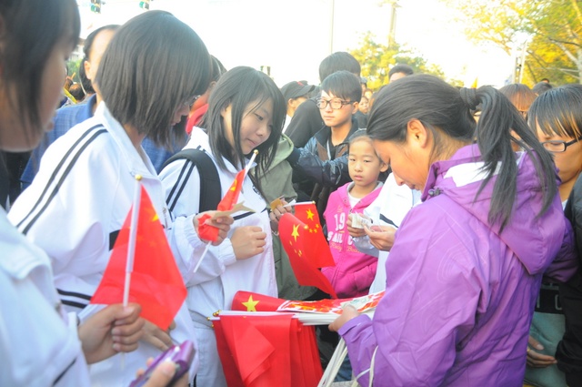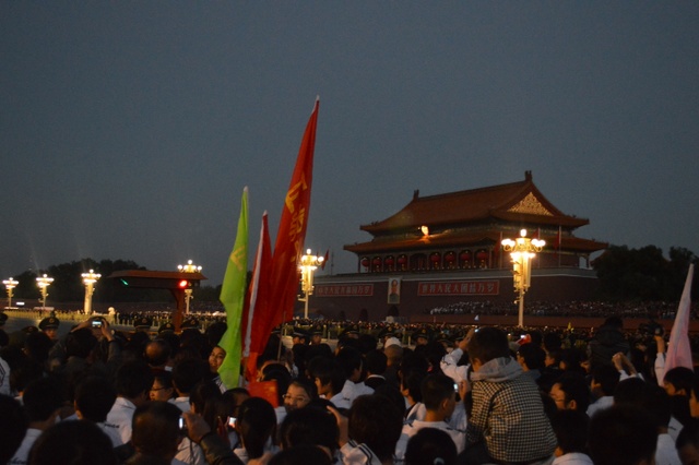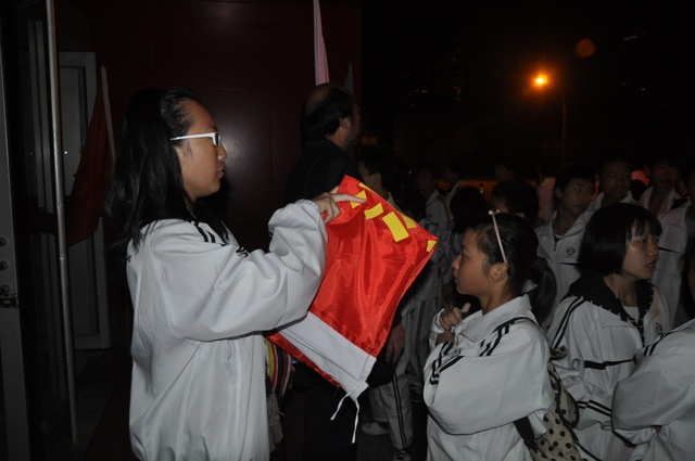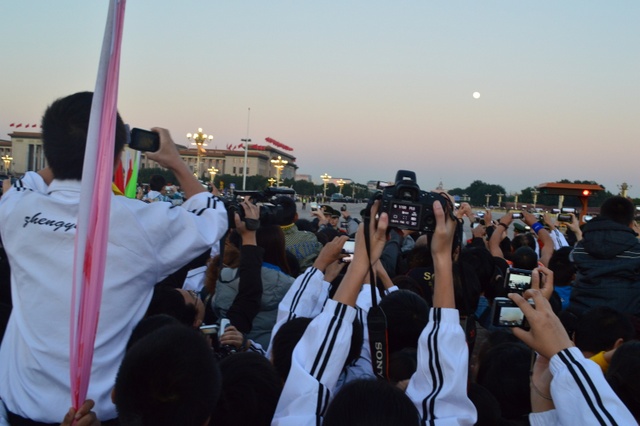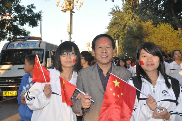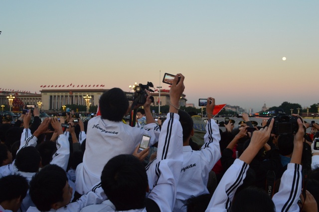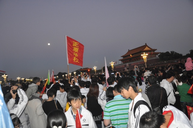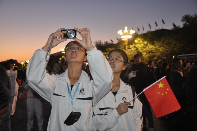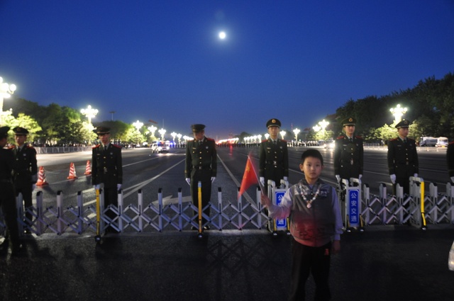 十月一日是我们伟大祖国的生日,今天清晨4:30,同学们便起床了,在校长和老师的带领下,匆匆赶到大望路地铁站乘车前往天安门广场,当日靠近天安门东的地铁站不开放,我们只得从王府井下车,然后跑步前往天安门,古人云“莫道君行早,更有早来人”,果不其然,在长安街通往天安门广场的路上,行人如织,我们也疾行在拥挤的人流当中,5:41分我们赶到天安门东侧时,早已是人山人海了,我们当中,有五个同学东钻西闯,终于挤到了东边的警戒线边,她们还不知足,请求警察叔叔让她们进到警戒线内,竟然得到了默许,机灵的同学一口气迂回到了正南面警戒线外的第一排,真正的零距离观看升旗,好幸运!而我们大部分人只得在人群中踮足遥望,许多同学将自己的照相机举得高高的,纪录那神圣的一刻。6:10分,五星红旗在现场乐队演奏的国歌声中冉冉升起。在祖国的首都近距离观看升国旗,感受那种浓浓的爱国情怀,确实有些心潮澎湃。
