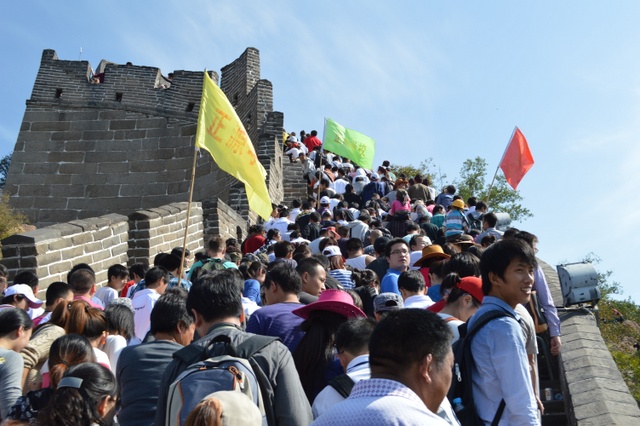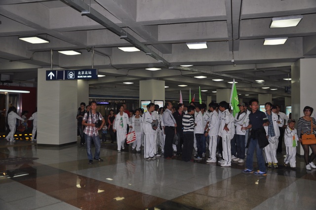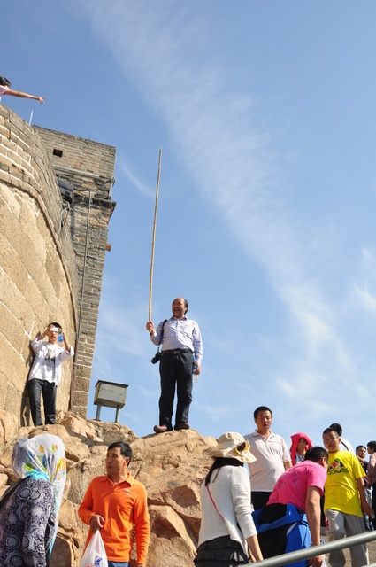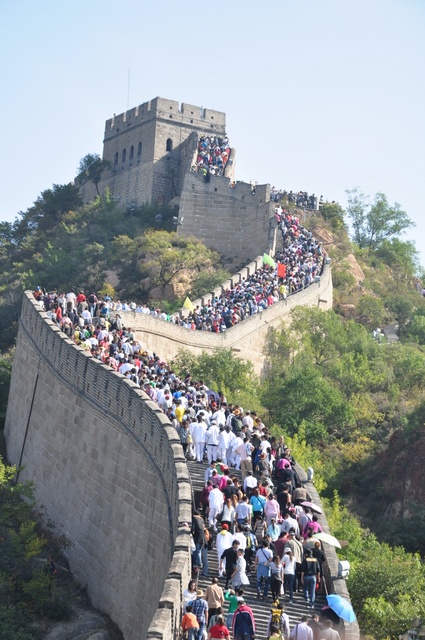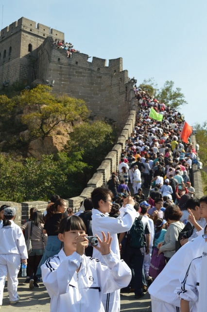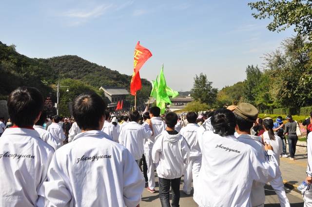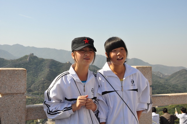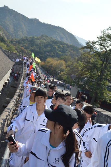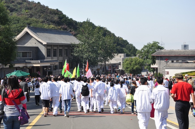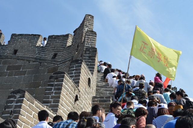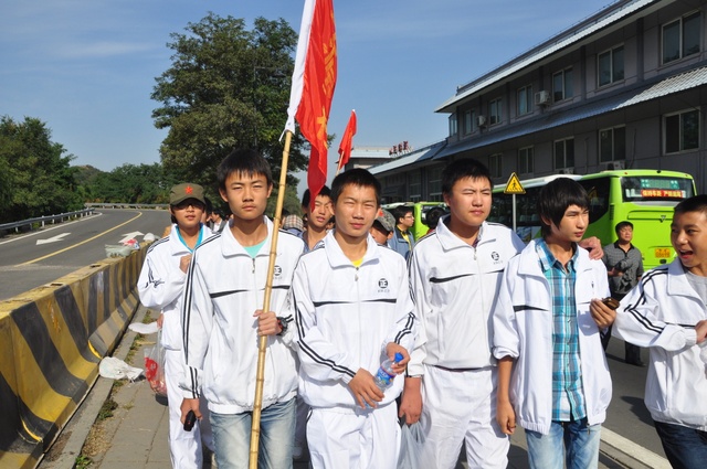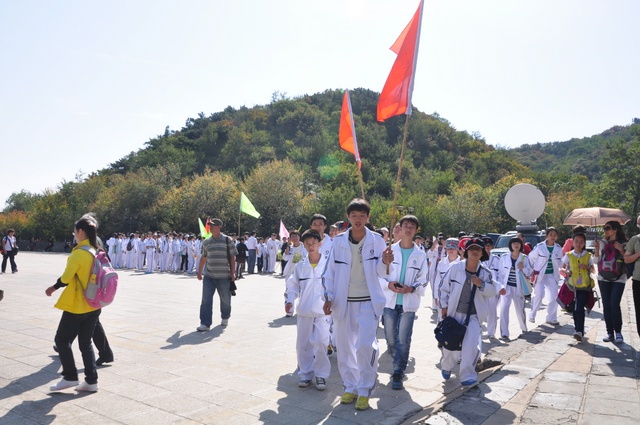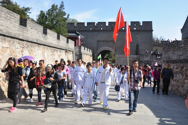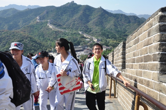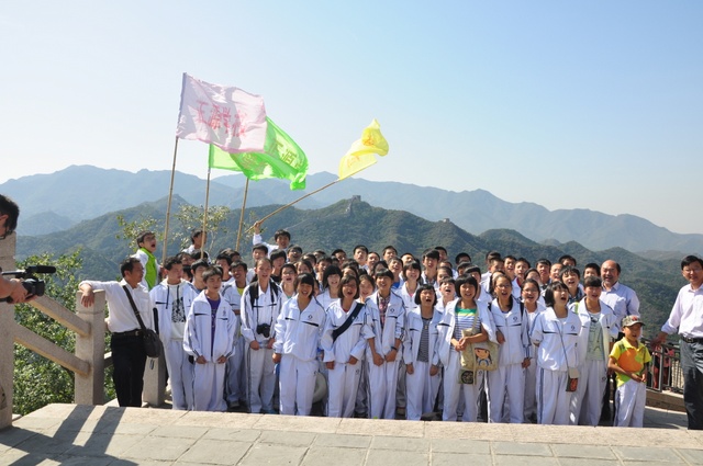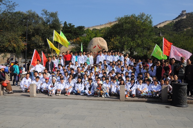 “不到长城非好汉”,登上八达岭长城,是我们这次励志的重要一站,10月2日早晨五点多钟,同学们便从宾馆出发,乘地铁1号线经西单转乘4号线到达北京北站赶乘当日第一趟列车,车站值班领导,看到我们这个庞大而亮丽的团队,格外眷顾,单独让我们提前候车和上车,九点二十分到达八达岭长城,登长城之前,大家在小广场合影留念,尔后迫不及待融入到人流之中向长城进发,刚进入长城,我们的校旗被迫取下,幸好同学白净的校服格加之旗手们高举的竹旗杆也格外耀眼,以至于被人流挤散的同学随时都能辨别主力队伍的方位。顺着凹凸不平,而且非常光滑的青石台阶往上走,不一会,好多游客显得有些吃力,不时站在城墙边休息。而正源的同学们却是那么精神焕发,在陡峭的长城上有的人走到游人稀疏的地方甚至还小跑起来。站在高高的烽火台旁,往下一瞧,可以看到脚下的长城蜿蜒起伏,气势磅礴,雄伟壮观如一条不见首尾的巨龙在绵绵山岭上翻滚爬动,同学们兴奋不已,突然有一种自豪的感觉,他们说,站在长城上,亲手触摸坚如磐石的城墙,仿佛感觉到了历史的心跳......有的同学还说,太震撼了,太不可思议了,在那么不发达的古代社会,我们的祖先竟然能创造如此伟大的长城,尤其在这么陡峭的高山之上,那些巨大的石头又是怎么移上去的?一些同学还说,可以想像,当年建设长城之艰难,相比他们,我们仅仅是攀登长城,何敢再言“辛苦”二字。中午时分,大家在长城上合影留念,并齐声抒发内心感言:“高山之巅,万里长城永不倒:凌云之志,傲视群雄看正源”。可见,这次学校组织的励志活动对同学们已经产生了深刻的影响。
