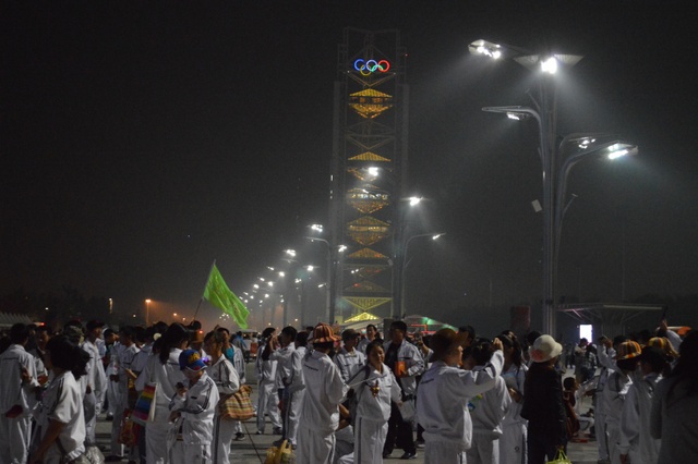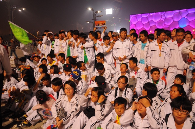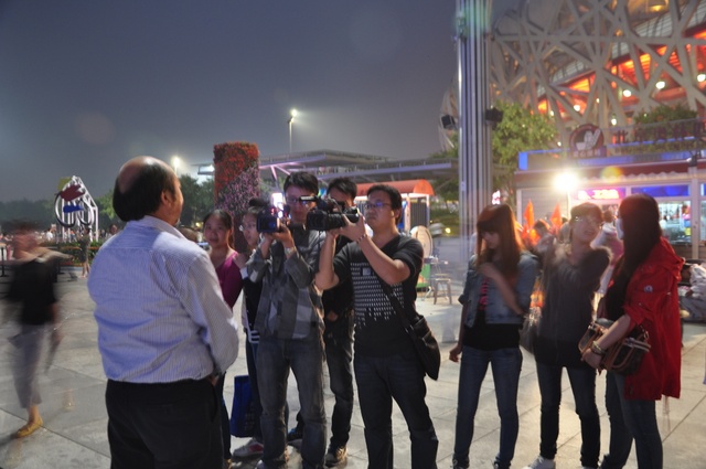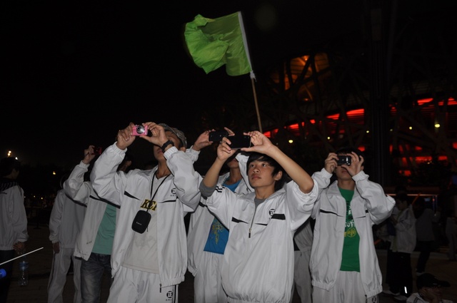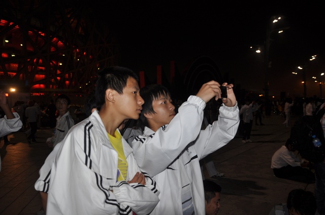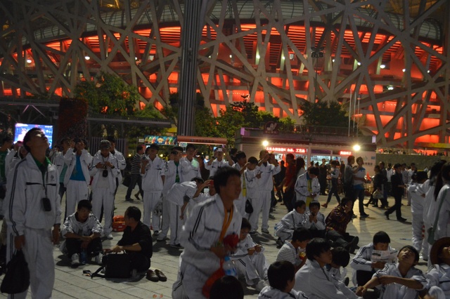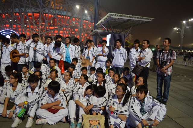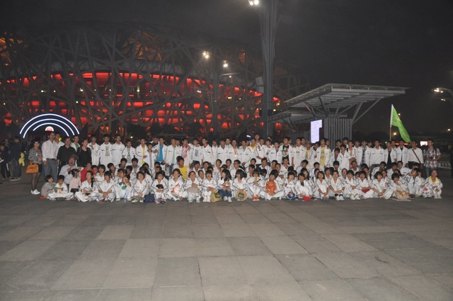 10月2日下午,同学们来到了庞大而美丽的奥林匹克公园,假日里的公园格外热闹,游客众多,同学们一直走到鸟巢和水立方之间的广场上,尽情欣赏这个凝聚着中国人智慧和成就的体育场馆,造型独特、钢筋铁骨的鸟巢显得雄姿英发,水立方蓝色的外表也在阳光下显得格外美丽,同学们有的拍照,有的摄像,不亦乐乎。走累了就围在广场中央席地而坐。用心感受伟大祖国繁荣昌盛的盛世景像,到了晚上,整个公园流光溢彩,又是一番奇景,鸟巢里面红色灯光将其构架勾画得更加清晰,大气磅礴;而水立方巨大的墙面美丽通透,一会儿红一会儿蓝一会儿紫亦真亦幻,神奇无比。
