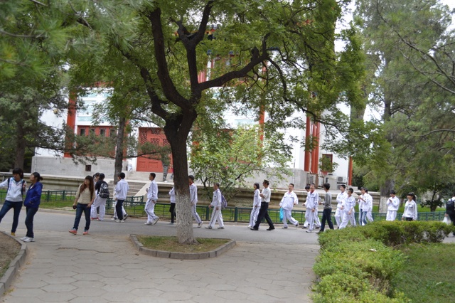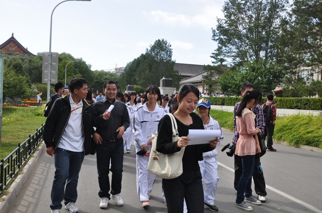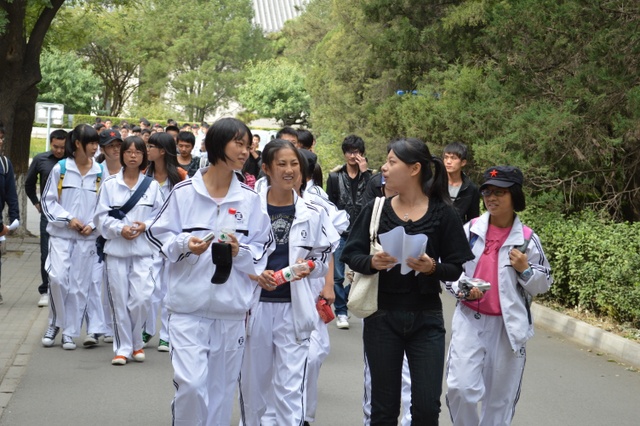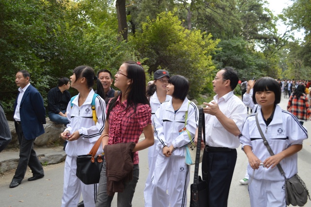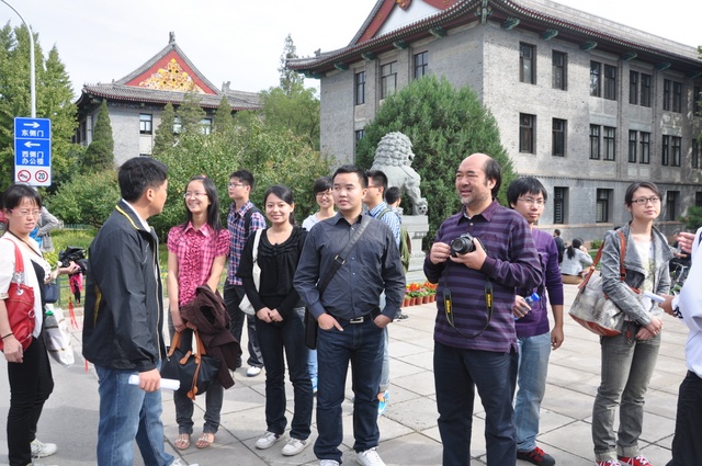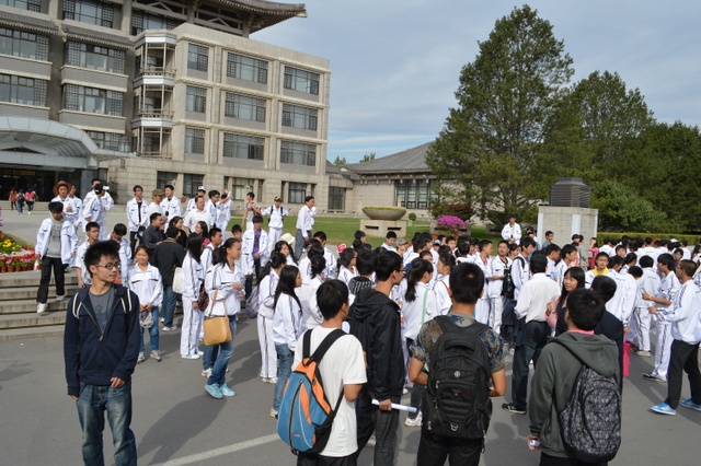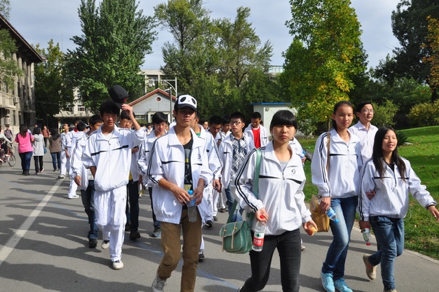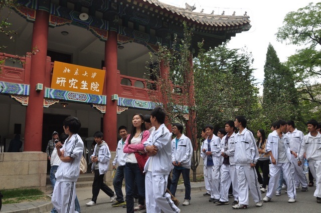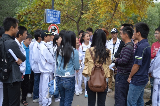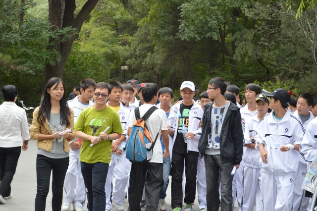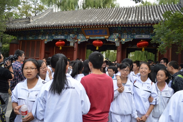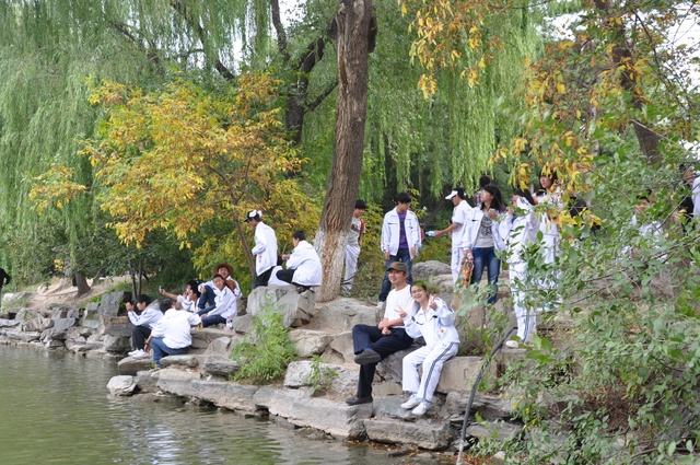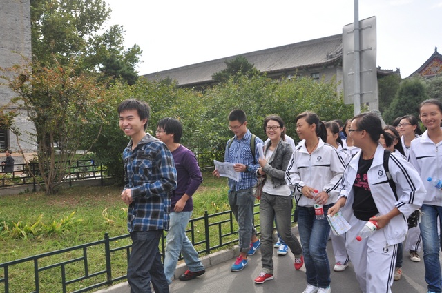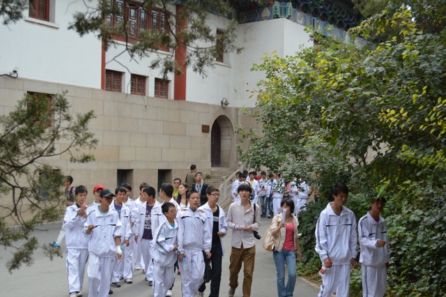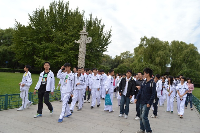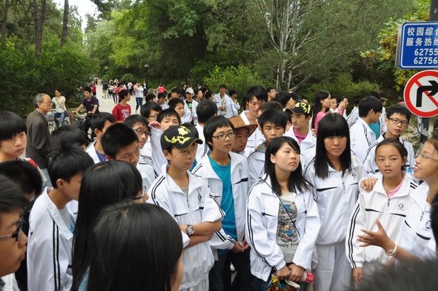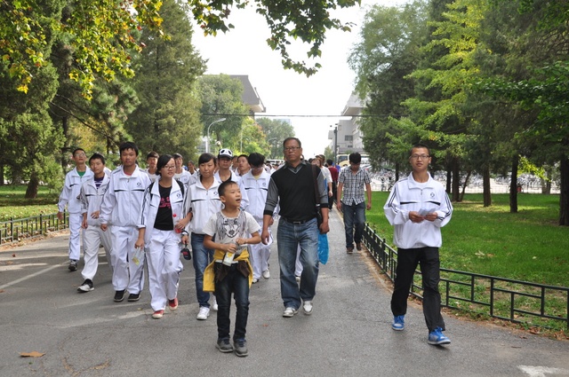 10月3日,同学们走进了励志之旅的核心区域。上午9点,当同学们来到北京大学,今年从正源考入北大的潘军早就在门口迎接大家,大队人马径直走到北大图书馆前面,不一会,30多个在京各高校的耒阳籍学长陆续而至,拍完大合影,同学们分成10多个小组在学长们的引领下,经过博雅塔然后漫步在未名湖畔,与学长们进行直面交流与探讨,边走边说,学长们耐心解答同学们提出的各种疑惑,并用自己的体会告诉同学们学习方法,其中如今年从正源考入北京理工大学的如杨云龙,那份热情,那份激情,还有那份才智让同学们钦佩不已;交流中,每一个小组有说有笑,气氛活跃。当日,绿树掩映、碧波荡漾的未名湖,让众多穿着白色校服的正源人点缀得风光无限,更加充满生机与活力。