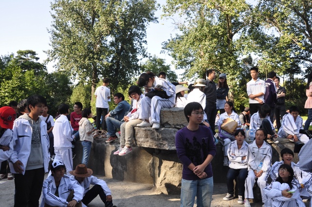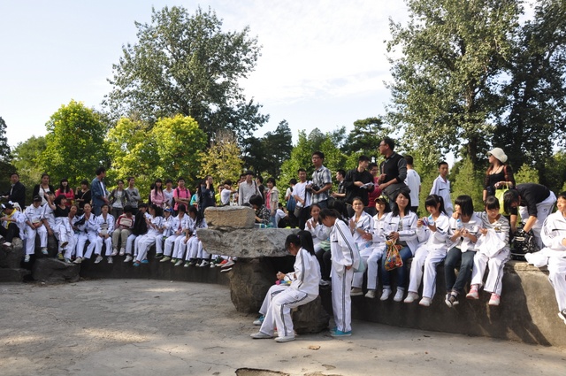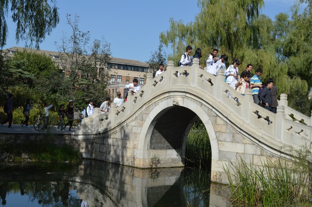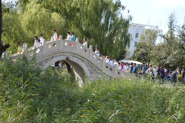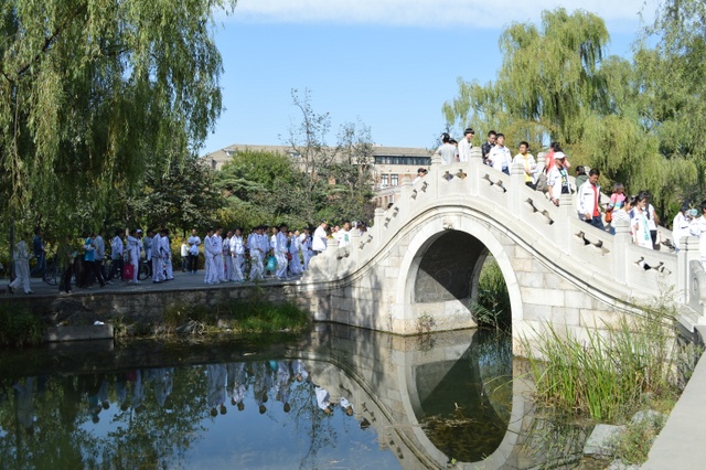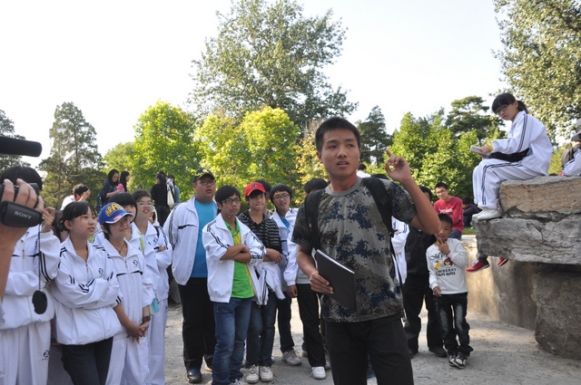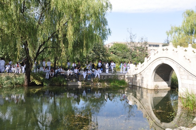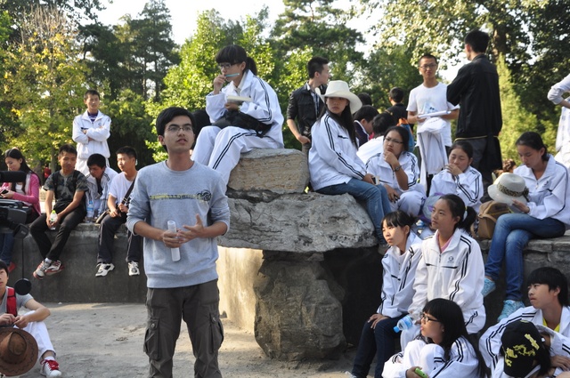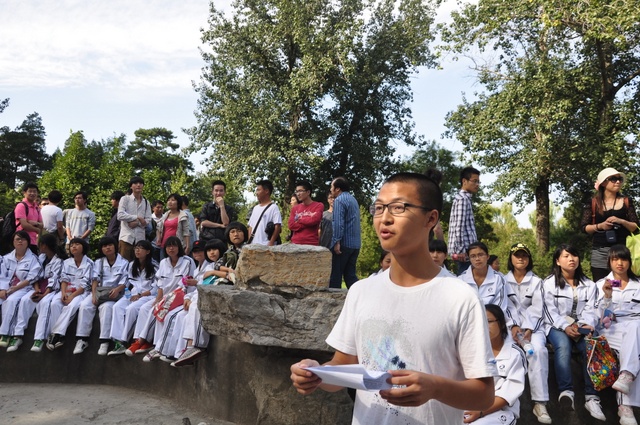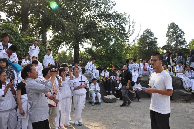 参观清华大学是同学们励志之旅的核心区域第二站,10月3日下午,同学们分散用餐之后,陆续进入清华大学,不经意间,同学们来到了清华大学的荷塘边,著名散文《荷塘月色》中的场景原形,同学们打坐在荷塘岸边,细细观赏,品味朱自清当年那份心境,仿佛每一片荷叶上都在诉说着那份宁静和惬意。约莫半个小时之后,罗校长和那些耒阳学长们也到了,队伍集合一起越过荷塘石拱桥便进入“近春园遗址”,亦称“荒岛”。荒岛四面环水,岛上花木葱茏,绿草茵茵,水榭亭阁,掩映绿树丛中。同学们沿着平整的小路,来到了一处怪石堆砌四周的干涸池畔,或站或坐,听取北大学生潘军、清华大学在读研究生谭树龙、本科生黄一挥、人民大学在读研究生贺佐琪、中央财政大学在读研究生谢幽篁、中国政法大学在读研究生周芙蓉以及中国航空航天大学的谢正飞等介绍自己在求学路上取得的成功经验和学习方法,同学们深受启发,开始思考自己奋斗目标,尤其是坚定了自己刻苦学习信心和决心。
