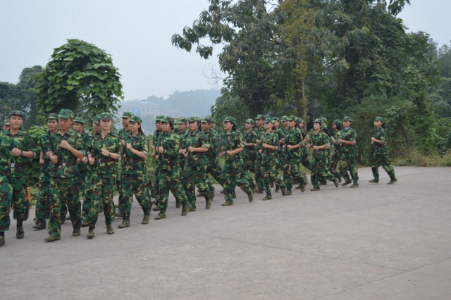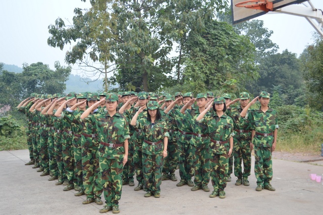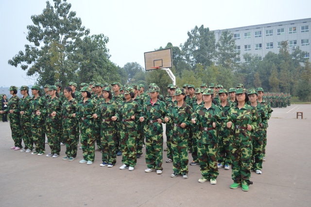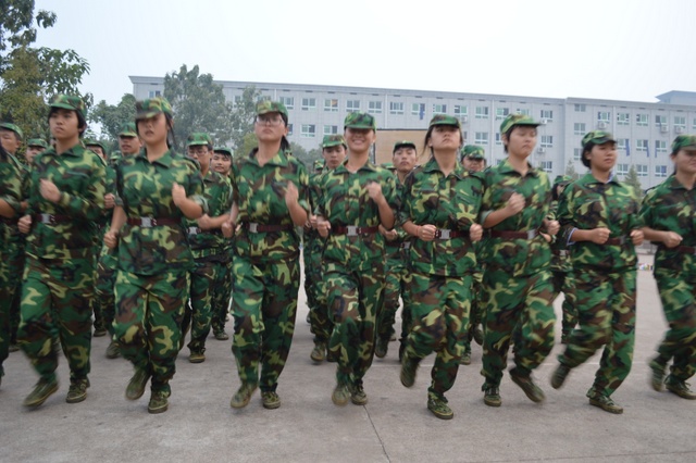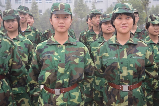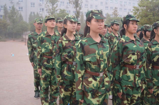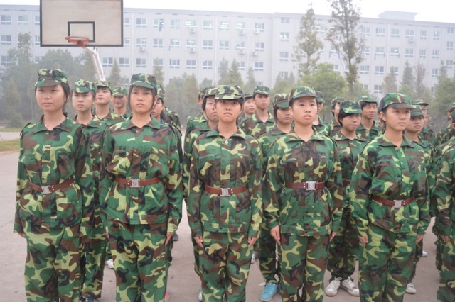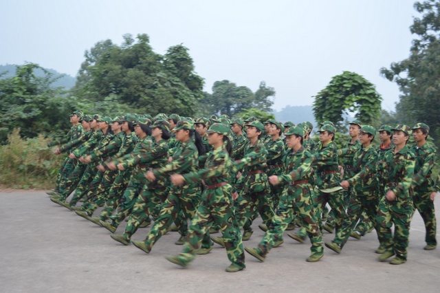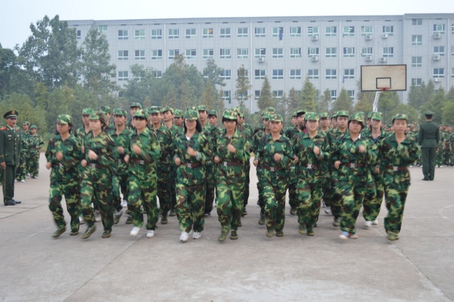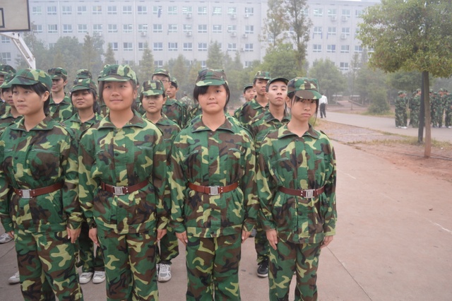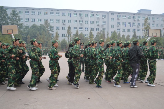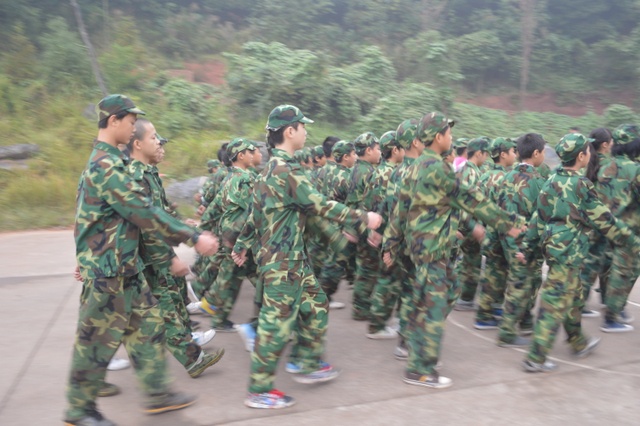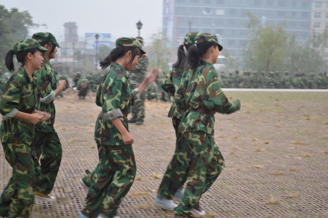 今天训练的内容除了复习巩固前几天训练内容外,绝大部分班级增加了跨立、敬礼、跑步等内容。理想的天气,加上教官更加严格的训练,各班进步很大,士气旺盛,口号声响彻整个校园。