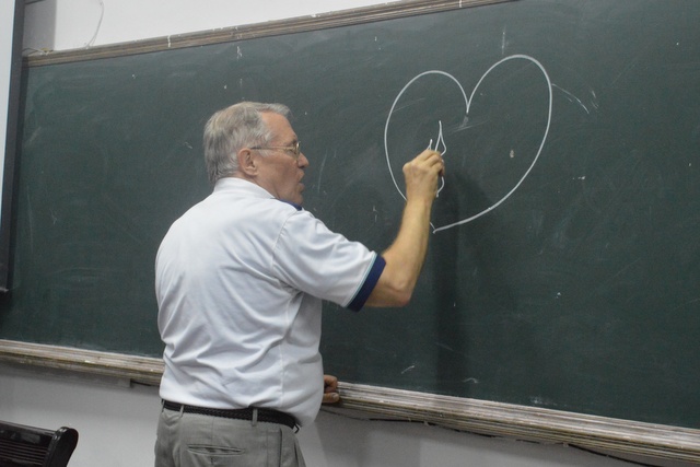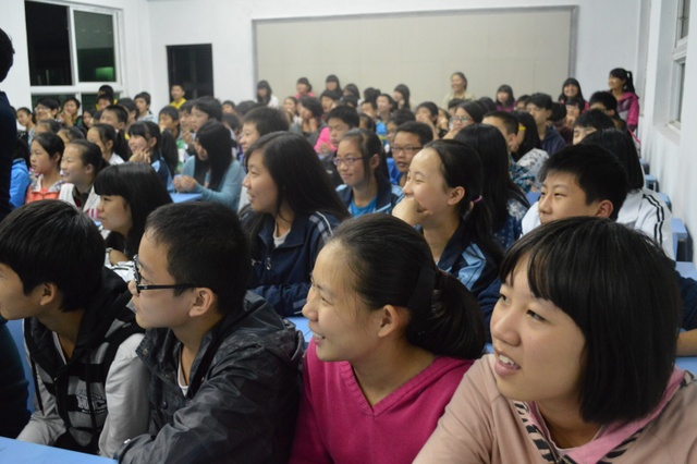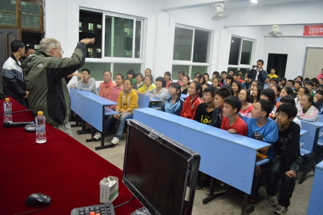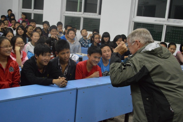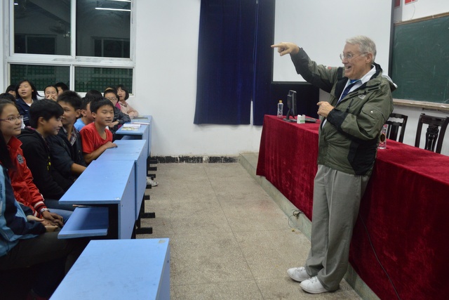 2012年11月6日晚上,美国卡尔(Carl)先生在我校大会议室讲学,高一和准高一的学生代表共100多人参与听课。卡尔先生曾长期在中国执教英语,60多岁的他退休之后,仍热心教育事业,充满激情,在昨天的讲学中风趣幽默,不时引得全场笑声和掌声,期间,同学们用流利的英语回应卡尔先生的问话。