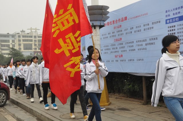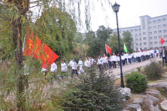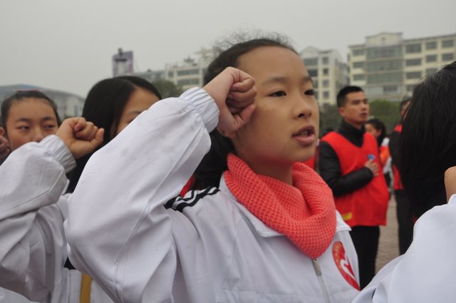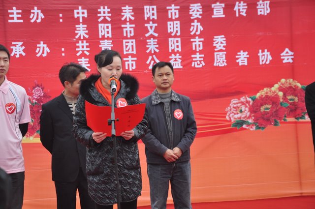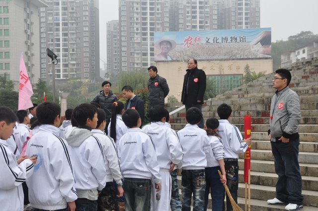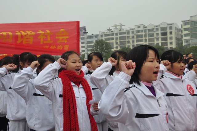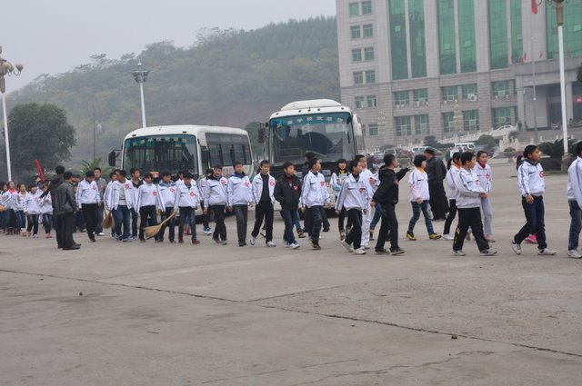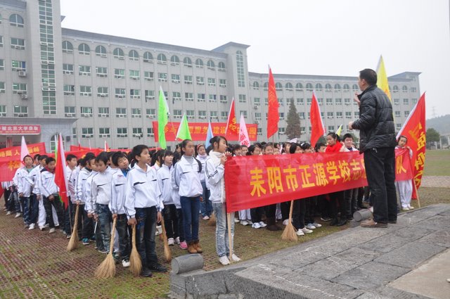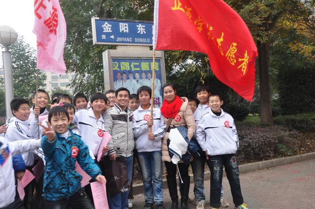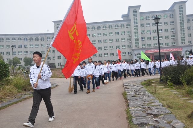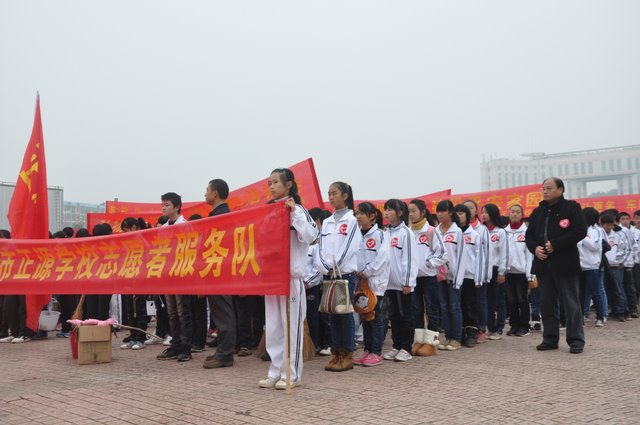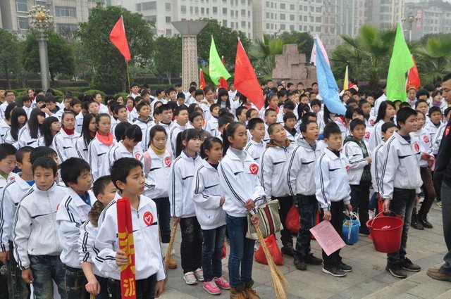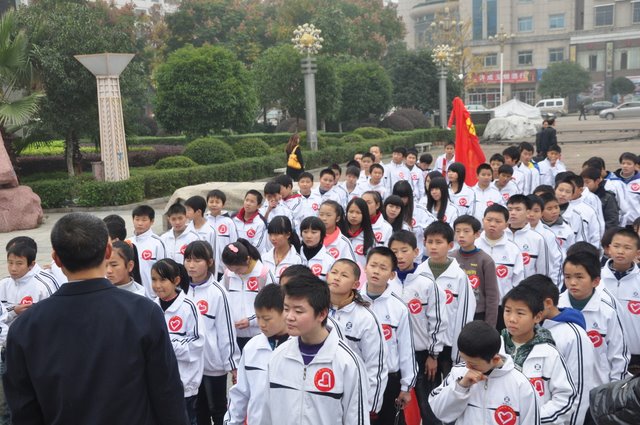 出发前,团委书记周文根老师在集会上说:“同学们,启动仪式后我们要走上街头路口开展志愿者服务,就是用我们的奉献精神感染广大市民、用我们的文明举止引导广大市民,全面展示文明形象。”在周老师强调了活动的要求和纪律后,我们的队伍就朝着耒阳市志愿服务活动启动仪式地点---发明家广场出发了。