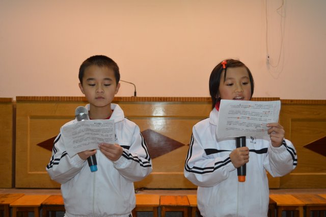 各参赛班级服装整齐,队列新颖,歌声飞扬。孩子们精彩的演唱中各有新意,令人眼前一亮。《读唐诗》、《神笔马良》、《蜗牛和黄鹂鸟》、《左手右手》……随着一首首参赛曲目的演唱,时而歌声响亮,充满激情,时而婉转悠扬,温馨舒畅。悠美的旋律夹着孩子们稚嫩的歌声在学校报告厅久久回荡
