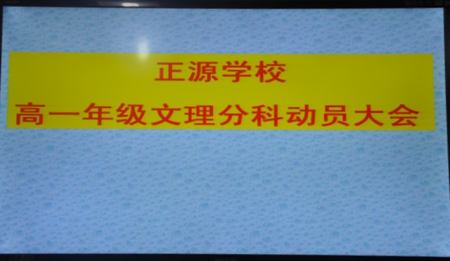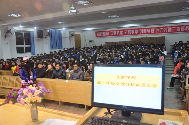 2013年1月18日晚上,高一年级文理分科动员大会在报告厅举行,高一全体学生及科任老师共500余人参加了动员会。会上,罗校长作主题报告,他首先对正源学校高中学生学业成绩作了评价,对高考充满了必胜的信心,其中还对高一年级学生自觉学习的的积极性给予了充分肯定。其次,对于文理分科,罗校长说,这是每个高一学生必须面对的选择,希望同学们一定要根据自己的兴趣作出正确的选择。第三,根据分层教学的原则,文理分科之后,学校对班级进行重新组合,是必然的。希望同学们明确目标,努力学习。最后,罗校长说,自己的事情自己可以作主,有其它想法或建议,可以通过有关形式向学校提出来。