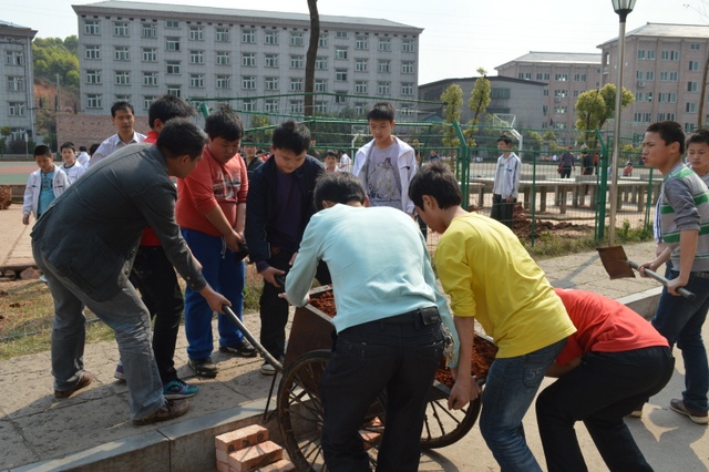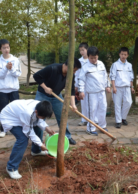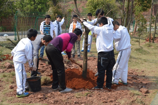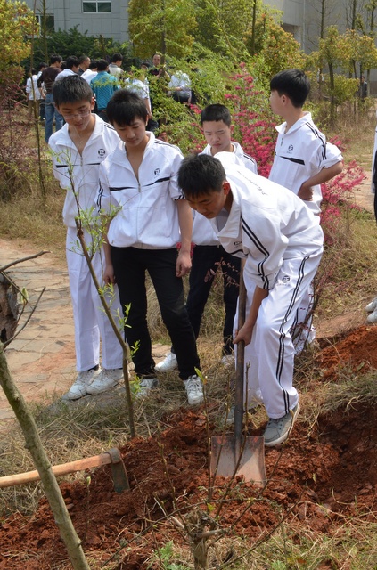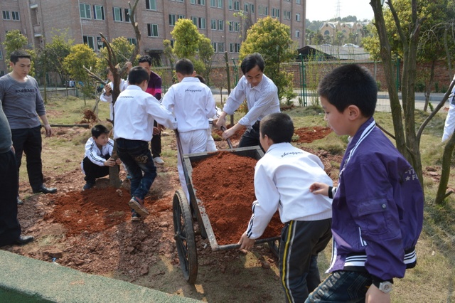 3月12日,食堂工人早早地就把树苗运到了种植地点。初中部在学部和年级的统一指挥下,师生齐上阵,挖坑、浇水、培土,一个半小时的功夫,20棵树就在第三食堂前的池塘周围栽种成功。小学部则主要由老师负责栽种,高年级的孩子们负责浇水。一个下午,他们以31棵超额完成学校下达的20棵植树任务。高中部的高三学子们种植毕业纪念树,则将整个植树活动推向高潮。他们在老师的指导下,自己挖树苗、运树苗、种树苗,个个汗流浃背,场面热火朝天,种下了18棵毕业纪念树。最令人感动的是应届文科班,男生少,女生多。但女孩子们一句“我们文科班的女生绝不是孬种”震撼全场。无论挖树苗,还是抬树苗、扶树苗,他们一点也不逊色男生。从4:30—6:00,学校即将修建的女生大道两旁,就栽下了18棵高大的樟树。