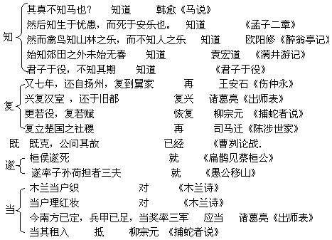 注:讲大纲要求掌握的常用词“知”、“复”、“既”、“劝”、“遂”、“当”用幻灯打出这些常用词在初中使用过的句子,并注明出处,让学生快速回答。