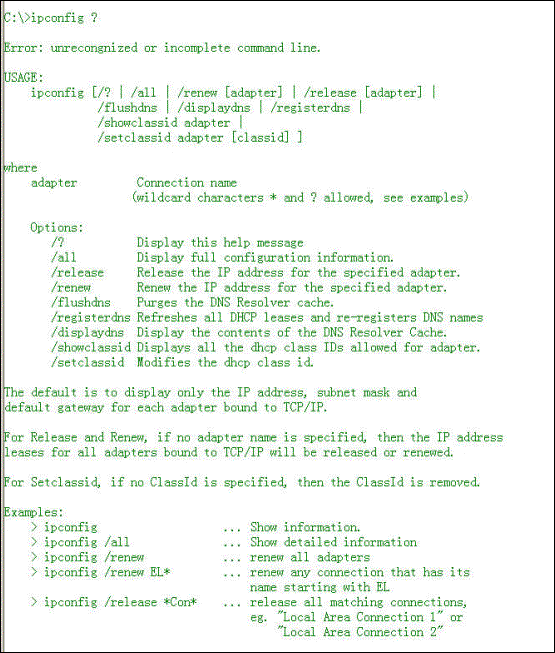 ipconfig [/all] [/renew [adapter] [/release [adapter] [/flushdns] [/displaydns] [/registerdns] [/showclassid adapter] [/setclassid adapter [classID]