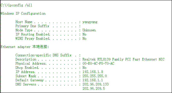 /all 显示所有适配器的完整 TCP/IP 配置信息。 在没有该参数的情况下 IPCONFIG 只显示 IP 地址、子网掩码和各个适配器的默认网关值。适配器可以代表物理接口 ( 例如安装的网络适配器 ) 或逻辑接口 ( 例如拨号连接 ) 。