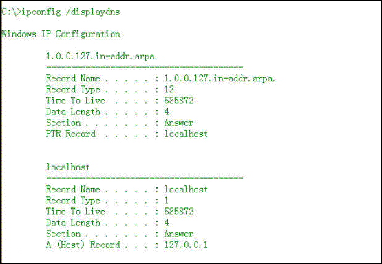 /displaydns 显示 DNS 客户解析器缓存的内容, 包括从本地主机文件预装载的记录以及由计算机解析的名称查询而最近获得的任何资源记录。 DNS 客户服务在查询配置的 DNS 服务器之前使用这些信息快速解析被频繁查询的名称。