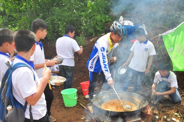 下午1:00点左右,同学们开始了鹿岐峰上有史以来最庞大的野炊。1800多名师生闹鹿岐,垒灶的垒灶,捡柴的捡柴,提水的提水,切菜的切菜,洗碗的洗碗,忙得热火朝天。半个小时后,同学们吃到了自己亲手做的中餐,脸上洋溢着快乐的笑容。野炊不仅体会到了团队的力量与快乐,更增进了相互之间的感情。