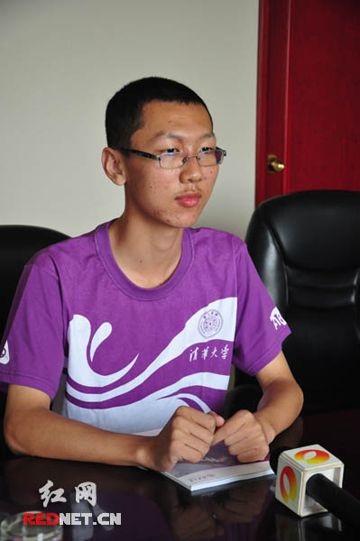 今天的他身穿一件紫色条纹的T恤,胸前写着“清华大学”。原来,高考成绩出来之后,清华大学负责湖南地区招生的老师找到了他,并送给他这件T恤,希望他能够报考清华大学。