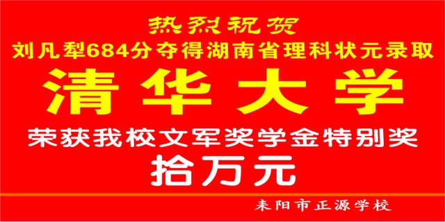 刘凡犁以684分夺得湖南省理科状元录取清华大学,获得正源学校奖学金10万元!