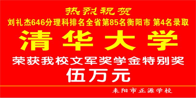 刘礼杰分以646分理科排名湖南省第85名、衡阳市第4名录取清华大学获得正源学校奖学金5万元!