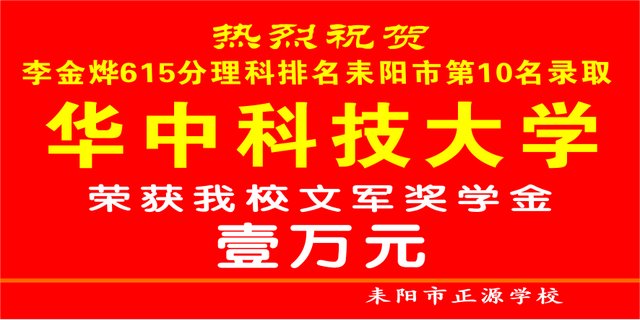 李金烨 615分耒阳市理科第10名 华中科技大学1万元