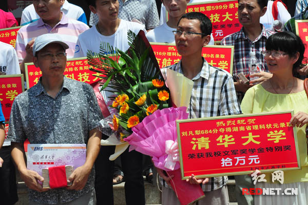 红网长沙7月25日讯(通讯员 彭晨 记者 董雷)“书中自有黄金屋”并非虚言,一手握着清华大学录取通知书,一手抓着10万元现金,2013年湖南高考理科卷面分第一名刘凡犁的笑容,绽放在一片掌声中。